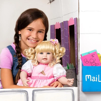 I Scream, You Scream, We All Scream for Ice Cream! Irresistibly sweet, ToddlerTime Doll Ice Cream Party is your little ones fun playmate with her delectable smile and lifelike expression! This realistic baby doll is dressed in a pink and white layered petal party dress with rainbow sprinkles, polka dots & playful ice cream embroidery with tulle. Her light blonde ringlets and curls are an eye delight styled in ADORAble pigtails with cute pom-pom hair accessories. This lifelike baby dolls bright blue eyes perfectly match that oh-so-sweet toothy smile and blush on the cheeks. She is ready to step out with her lace edge socks and white faux patent Mary Jane shoes, and even ready to come with you in fun adventures with Adora Flower Power Baby Doll Car Seat! ToddlerTime Ice Cream Party is so sweet in any angle you look at herfrom her beautiful curls down to her tiny baby feet! Shes 20 inches from head to toe and made of baby powder scented high-quality vinyl with a movable head and vinyl arms and legs. This baby doll looks so real with her weighted cloth body which makes her weigh and feel like a real baby! This 20-inch play doll comes complete with a traditional diaper for realistic play to develop social skills while engaging in nurturing, pretend play! Perfect gift for holidays and birthdays for ages 6 and up.