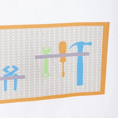 Time to head out to the shop and show off your carpentry and DIY skills with our Garage and Tool Workshop Playhouse Tent and Pretend-Play Tool Set. The roomy 44″L x 44″W x 50″H polyester play tent with sturdy plastic poles is a dream-come-true for kids who want their own space to pretend to fix and build things. Tie-back doors and open windows offer plenty of light and air while they play, and the colorful floor is printed with a road pattern. Its printed roof and colorful green trim will complement a playroom, bedroom or family room.The shelf on the back wall gives young carpenters their own work space, and the colorful fabric cabinets feature doors that remove with hook and loop tape, and reveal plenty of storage space beneath for tools and toys. Tools, jars, and paint cans are printed on the interior of the tent to add even more character.Set includes our 19-Piece Pretend-Play Tool Set for the full play experience. Tools include plastic hammer, saw, screwdriver, wrench, pliers, battery-operated drill (3 AA batteries required, not included), plastic hardware, adjustable tool belt, and plastic hard hat.Perfect gift for kids who love pretend play and role-play. Adult assembly required. Spot clean tent.