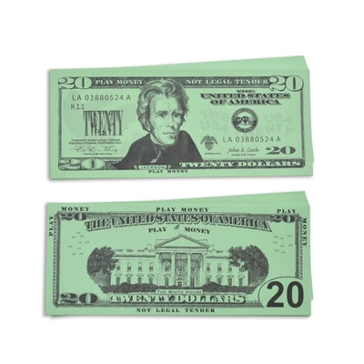 Learning Advantage Play Bills, $20 Bills, Set of 100 | Counting and understanding money concepts is a skill that lasts a lifetime. These Learning Advantage Play Money Bills approximate real currency in size and color. Set of 100 packaged in a polybag. A great tool to use in teaching money management or math at home or in the classroom.