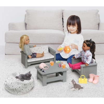 Badger Basket’s Living Room Furniture Set for 18 inch Dolls has ample, padded seating and generous table space for gatherings with several doll friends and plush pets. Includes a long couch, wide chair, spacious table, and squishable beanbag. For children ages three and up and dolls up to 18 inches. Made with wood, MDF, and fabric. Wipe and spot clean as needed. Overall assembled dimensions of the couch: 16.25 inches L x 8 inches W x 7.5 inches H. Adult assembly required.