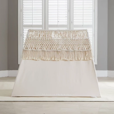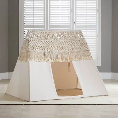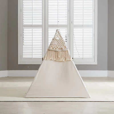 Our beautiful Macramé Playhome is truly one of a kind! The handwoven roof is light and airy, and is absolutely a work of art. The fringes connect to the cotton cover with rope that laces through the grommets. Front door rolls up and down. Metal frame with plastic connectors makes for a sturdy playhome for any playdate. Feeling groovy!