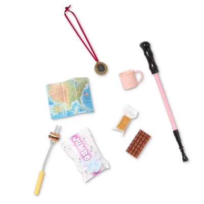 - Includes: doll, plaid shirt, tank top, skort, knee-high socks, hiking boots, bag of marshmallows, chocolate bar, bag of crackers, mug of hot chocolate, s’more on a stick, hiking stick, compass, map, storybook, and bookmark.