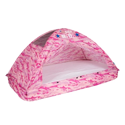 Our Pink Camo Bed Tent is perfect for any child with a love for fun, colorful designs! This 77 in X 38 in X 35 in bed tent perfectly fits any twin-size mattress, making it the ultimate hideout fort or reading nook. The Ultra-Mesh keeps fresh air coming in and the doors can be tied back, making it a great space to hang out in day or night. There’s even an interior pocket for all those important goodies! The included nylon storage bag also makes it easy for travel and storage for wherever your little one chooses to dream.