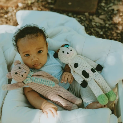 Mooove on over and let the party begin! This cow has been planning hours of fun and can’t wait to meet her new friend! Handmade with soft organic cotton yarn, this knit toy is super cuddly. The rattle inside gives a soft jingle when shaken.