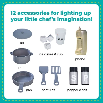 - INCLUDES 11 ACCESSORIES: Includes a cordless phone, spatula, a pot, a pan, a lid, and 2 plastic shakers, 3 ice cubes, and a cup to encourage role play and light up your little chef’s imagination